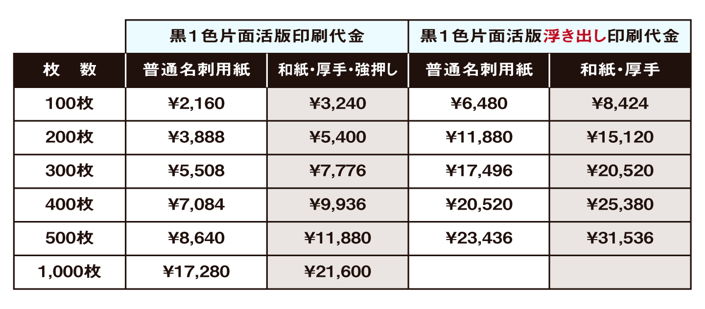印刷代金のみ価格を示します。通常の印刷と、和紙やハードプレス(強押し)の価格は少し違います。基本用紙を使用した活版名刺印刷代金は別に示しましたが、こだわりの用紙を使用した場合は、用紙代金+印刷代金で算出します。(初回には凸版代金やデザイン代金がこの他に必要です)