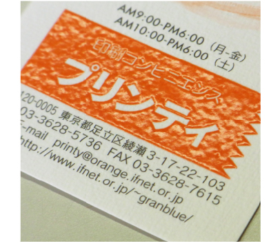 活版印刷は極めて初元的なシンプルな印刷方法です。そこに、活版印刷の良さと特徴、そしてデメリットもあります。本来、活版印刷もオフセット印刷と変わらないきれいな印字を目指して追及してきましたが、現在活版印刷に求められているものは、活版らしさだと思います。プリンティの活版印刷は、正確には凸版印刷です。活字による組み版は現在はプリンティでは残念ながらお受けしていません。ご注文の多くは名刺ですが、活版でしかできない印刷というものもあります。印刷の原点ともいえるプリンティングをぜひご活用ください。